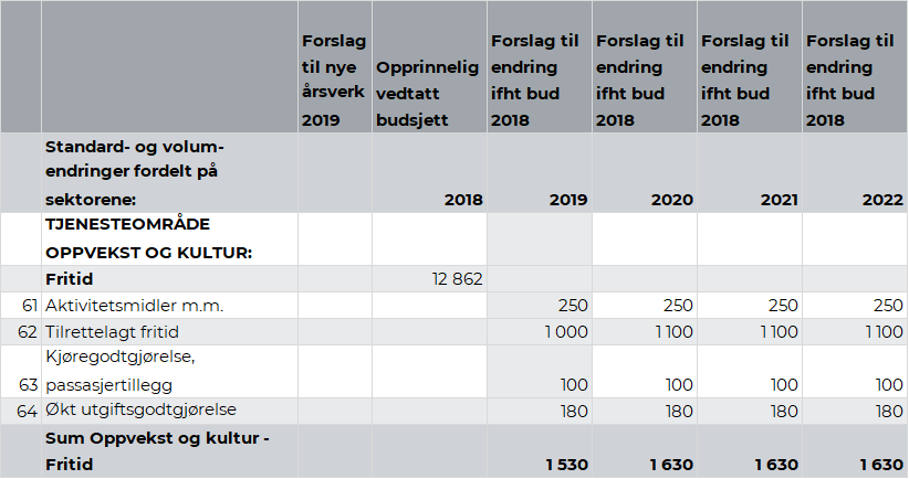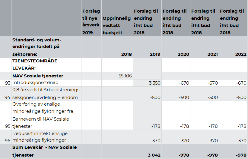 Utvalg for levekår behandlet 5. april 2017 sak 13/17 Status sosialhjelp – aktivitetsplikt. Opprettelse av Arbeidstreningsseksjon, hvor det ble vedtatt at Lag A skal være en del av del av Arbeidstreningsseksjonen. Som en del av k-sak 41/2018 Budsjettoppfølging 2018 – drift ble det vedtatt å flytte ett årsverk fra Lag A, samt driftsmidler fra virksomhet Psykisk helsearbeid og rus til Arbeidstreningsseksjonen underlagt virksomhet Eiendom. Som en videreføring av dette anbefaler rådmannen å overføre totalt kr 1,03 mill. fra rammen til Psykisk helsearbeid og rus til Arbeidstreningsseksjonen. Denne linjen har en motpost på linje 91. kapittel 2.7.3.22 Psykisk helsearbeid og rus.