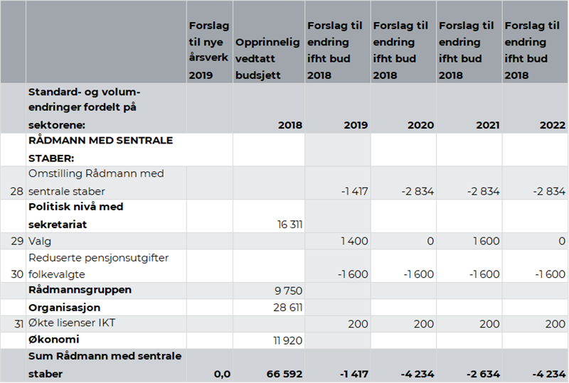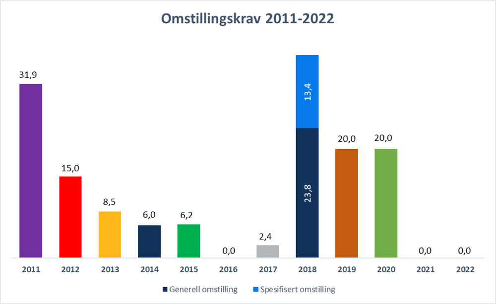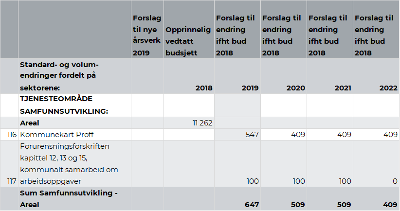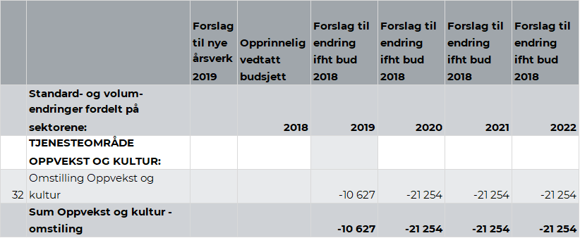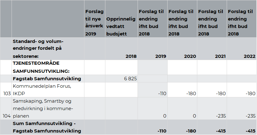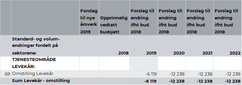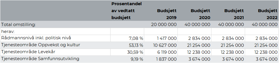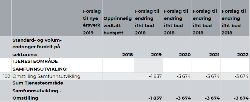 Rådmannen viser til kapittel 2.5. Omstilling. Omstillingsbidrag fra tjenesteområde Samfunnsutvikling er på kr 1,8 mill. i 2019. Dette utgjør 1,6 prosent av budsjettrammen for tjenesteområde Samfunnsutvikling. Videre legges det opp til ytterligere opptrapping i 2020 og et samlet omstillingskrav på kr 3,7 mill. i forhold til vedtatt budsjett 2018.