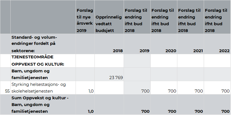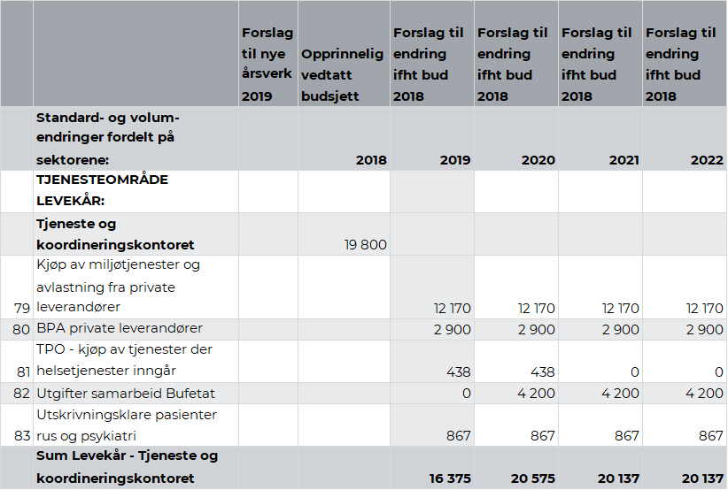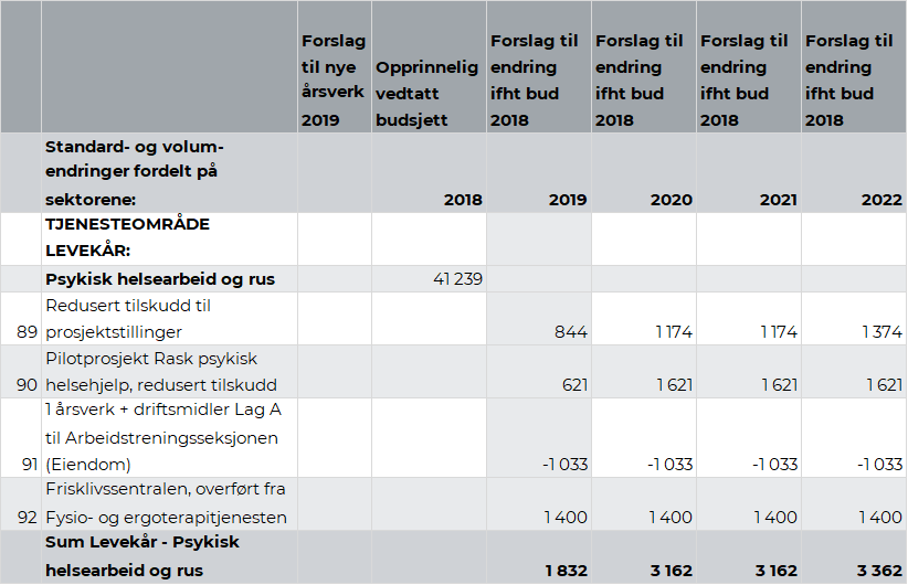 Fra 2019 må kommunen selv dekke kostnadene til Lag A, i tillegg til at det er en økning i kostnader til erfaringskonsulent og psykolog. Videre må kommunen dekke hele kostnaden til erfaringskonsulent fra 2020 og psykolog fra 2022. Rådmannen anbefaler å bevilge kr 0,84 mill. fra 2019, kr 1,17 mill. fra 2020 med en økning til kr 1,37 mill. i 2022.