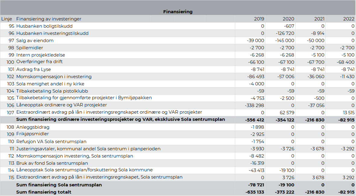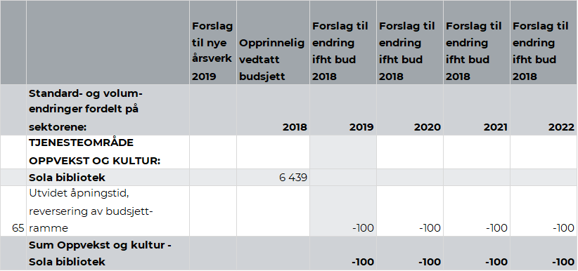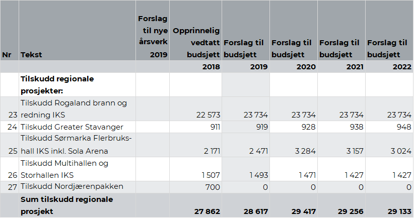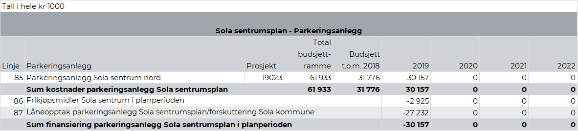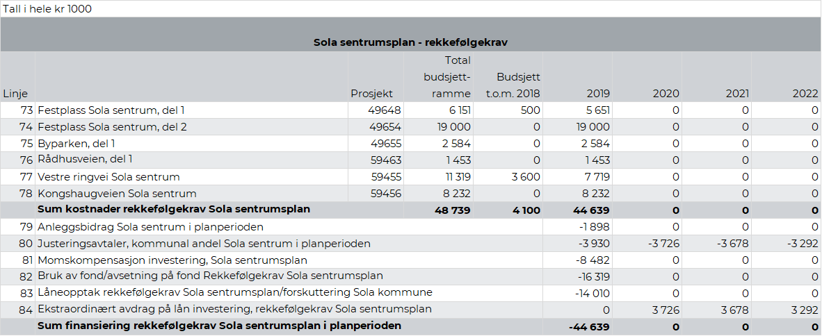 Sola kommunes bidrag til det felles planarbeidet var kr 0,18 mill. i 2018. Som følge av forsinkelser i arbeidet er det beregnet at kommunen i 2019 skal betale kr 0,07 mill. for arbeidet. Tiltaket reduseres i sin helhet i 2020.