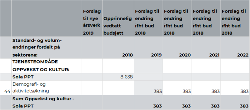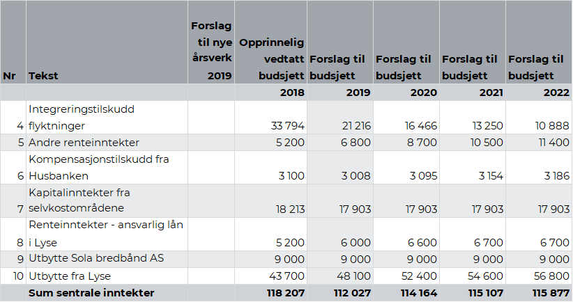 I slutten av hvert år sender IMDI en anmodning til kommunene for bosetning av flyktninger for påfølgende år. I skrivende stund har Sola kommune ikke mottatt noen anmodning fra IMDI for 2019. På bakgrunn av dette forventer ikke rådmannen en økning i antall enslige mindreårige flyktninger i 2019. Rådmannen anbefaler derfor å redusere inntektene for enslige mindreårige flykninger med kr 0,37 mill. fra 2019.