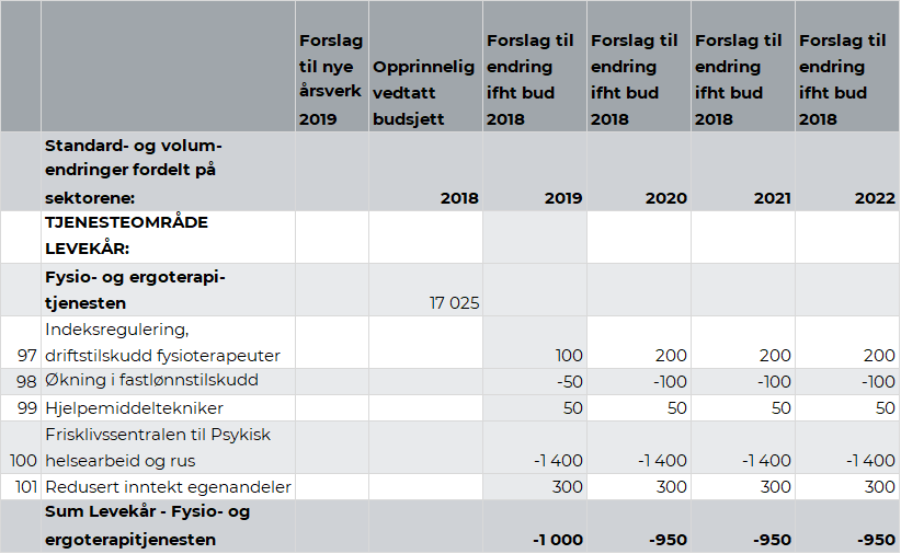 Driftstilskudd til fysioterapeuter utbetales til fysioterapeuter som har driftsavtale med kommunen. Tilskuddet justeres årlig fra 1. juli etter forhandlinger mellom KS og fysioterapiforbundene. Rådmannen anbefaler å øke bevilgningen til driftstilskudd med kr 0,1 mill. i 2019 og videre med en økning til kr 0,2 mill. fra 2020. .