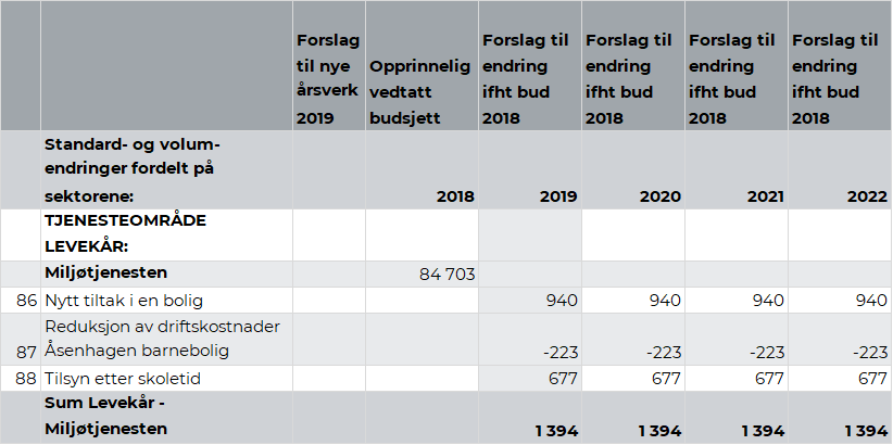 Fra høsten 2018 har det vært behov for å opprette et nytt tiltak i en bolig. For å dekke innbyggerens behov trengs det 3,5 årsverk. Gjennom reorganisering har virksomheten mulighet til å dekke 1,75 årsverk innenfor sin ramme, men mangler midler 1,75 årsverk. Rådmannen anbefaler å bevilge kr 0,94 mill. til 1,75 årsverk i Miljøtjenesten.