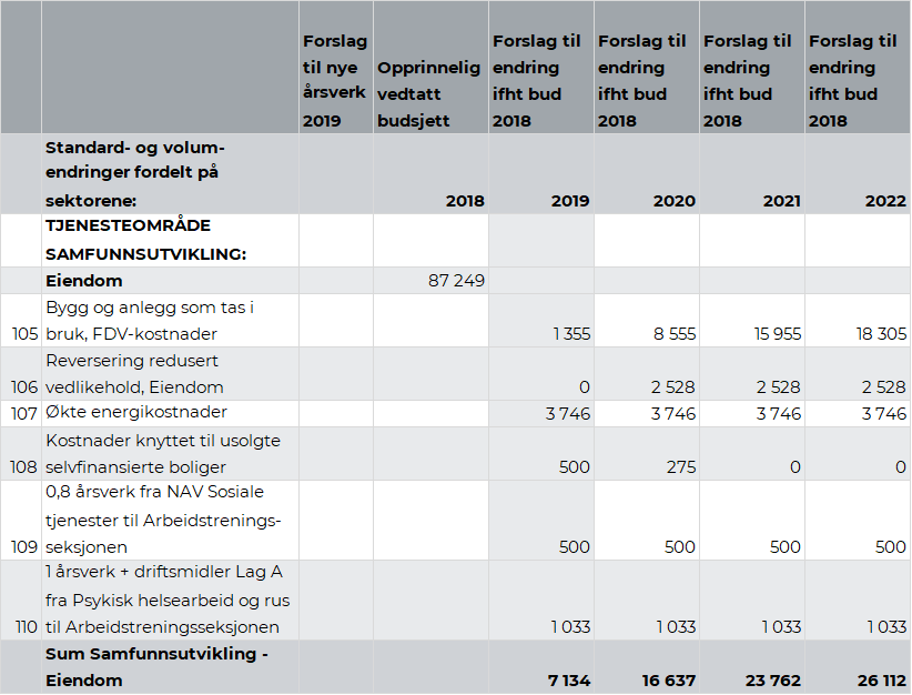 Utvalg for levekår behandlet 5. april 2017 sak 13/17 Status sosialhjelp – aktivitetsplikt. Opprettelse av Arbeidstreningsseksjon, hvor det ble vedtatt at Lag A skal være en del av Arbeidstreningsseksjonen underlagt avdeling Eiendom. I k-sak 41/2018 Budsjettoppfølging 2018 – drift per 30.04.2018 ble det vedtatt å flytte ett årsverk knyttet til Lag A samt driftsmidler fra virksomhet Psykisk helse og rus til Arbeidstreningsseksjonen. Som en videreføring av dette anbefaler rådmannen å overføre totalt kr 1,03 mill. fra Psykisk helsearbeid og rus til Arbeidstreningsseksjonen. Denne linjen har motpost på linje 110, kapittel 2.7.3.27 Eiendom
