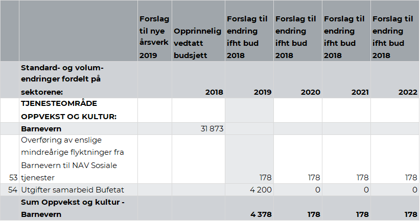 Ansvaret for enslige mindreårige flyktninger (EMA) er fra 1. mars 2018 overført fra Barnevern til NAV Sosiale tjenester. Endringen er gjort på bakgrunn av en samlet vurdering av hvor det er mest hensiktsmessig at denne tjenesten blir gitt. Kommunestyret vedtok 14. juni 2018 i sak 41/2018 Budsjettoppfølging 2018 - drift per 30.04.2018 å overføre ett årsverk og budsjett for EMA fra Barnevern til NAV Sosiale tjenester med virkning fra 1. mars 2018. Som en videreføring av vedtaket tilrår rådmannen å overføre helårseffekt av tiltaket på netto kr -0,18 mill. fra Barnevern til NAV Sosiale tjenester. Denne linjen har motpost på linje 53, kapittel 2.7.3.10 barnevern.