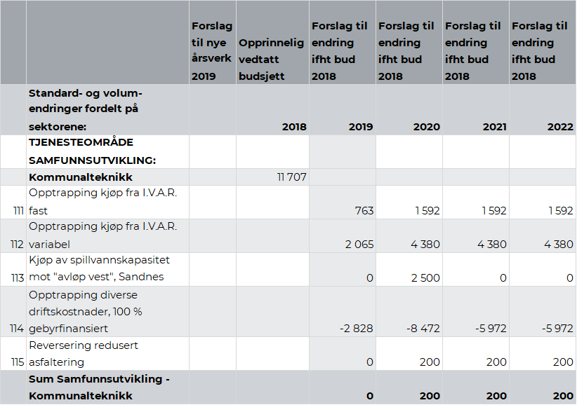Det ble i Handlings- og økonomiplan 2018-2021 vedtatt å redusere budsjettet for asfaltering på virksomhet Kommunalteknikk, seksjon vei i årene 2018 og 2019. Denne linjen reverserer dette tiltaket fra 2020 for å unngå for stort etterslep på asfalteringsprosjekter. Dette er i tråd med vedtatt HØP 18-21.