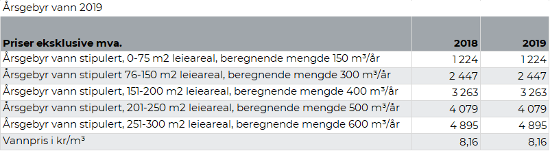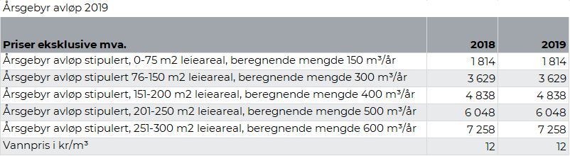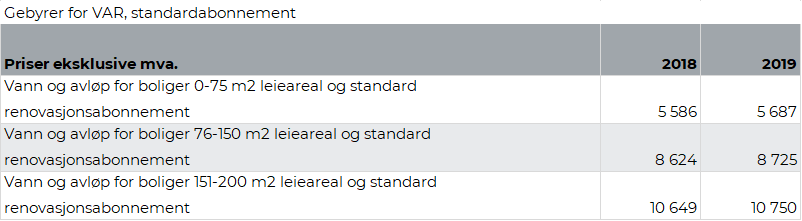 I tabellen nedenfor vises de kommunale gebyrer innenfor VAR-områder for husholdninger, basert på stipulert forbruk av vann og avløp innenfor de aktuelle arealklasser, samt ett standard renovasjonsabonnement (fastpris renovasjon, 120 liter restavfallsbeholder, 140 liter papiravfallsbeholder og 140 liter beholder for våtorganisk avfall). Leieareal = bruksareal (BRA) x 0,55.