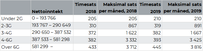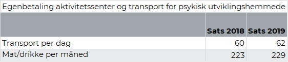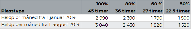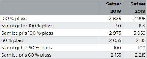 I forslag til statsbudsjett 2019 er det lagt opp til en maksimalpris på kr 2 990 per måned fra og med 1. januar 2019. Det er videre foreslått i statsbudsjett for 2019 en ytterligere økning på kr 50 fra og med 1. august 2019, noe som vil gi en maksimalpris på kr 3 040 per måned. Samlet maksimalpris for 2019 vil da bli kr 33 090.