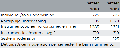 Til sammenligning er prisene for 2018 i Sandnes per semester kr 1 575 for individuell/solo undervisning, for parti/pulje undervisning (gruppe) kr 1 300 og leie av instrumenter kr 300. Satsene for 2018 er holdt uendret siden 2016, jamfør Sandnes kulturskole.