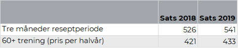 Egenandel for reseptperiode på tre måneder foreslås økt med 2,8 prosent i henhold til samlet pris- og kostandsvekst for kommunal sektor (kommunal deflator) 2019 til kr 541. Egenbetaling for 60+ trening foreslås også økt med 2,8 prosent til kr 433.