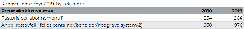 Renovasjonsgebyr for hyttekunder foreslås økt med 4 prosent i 2019. Økningen skyldes økte kostnader forbundet med innhenting av renovasjonen, blant annet som følge av økt mengde avfall og prisregulering fra renovatør.