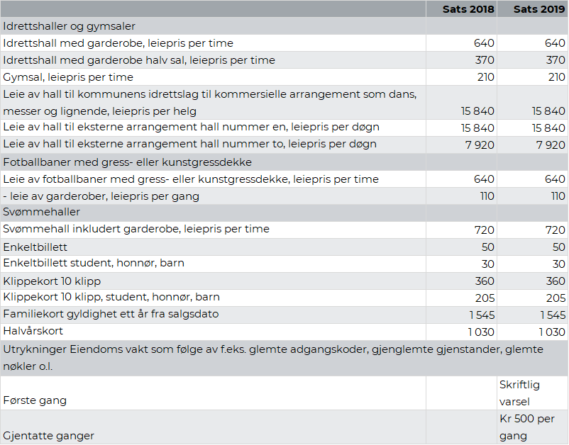 Rådmannen anbefaler at leieprisene for kommunale idrettsanlegg og gymsaler ikke øker i 2019. Dette har sammenheng med at rådmannen vurderer å redusere tilskuddet til lag og foreninger, og fremmer egen sak om dette. Prisen for bruk av svømmehaller foreslås økt med samlet pris- og kostnadsutvikling i kommunesektoren (kommunal deflator) for 2019 som er på 2,8 prosent. Det foreslås et nytt gebyr dersom vakten må rykke ut for blant annet glemte adgangskoder og andre mindre hendelser.