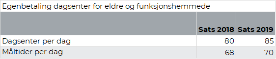 Betaling for dagsenter reguleres i Forskrift om egenandel for kommunale helse- og omsorgstjenester. I 2018 betales det kr 80 per dag for dagsenter. I tillegg betales det kr 68 per dag for måltider ved dagsenteret. Betaling for dagsenter i 2019 settes til kr 85 per dag i tråd med forslag til statsbudsjett 2019. I tillegg anbefaler Rådmannen at det betales kr 70 per dag for måltider ved dagsenteret. Det skal ikke betales for fravær som er meldt senest én uke i forveien, ved akutt sykdom og opphold i institusjon/sykehus.