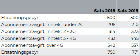 Rådmannen anbefaler å øke abonnementsprisen med 2,8 prosent. Etableringsgebyr på kr 500 beholdes. For de med inntekt under 2G økes maksimalsats i 2019 til kr 210.