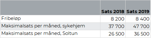 Betaling for langtidsopphold i institusjon reguleres av Forskrift om egenandel for kommunale helse- og omsorgstjenester: Det kan kreves 75 prosent av inntekt mellom kr 8 400 og folketrygdens grunnbeløp, og 85 prosent av overskytende inntekt. Fribeløpet før beregning av vederlag, kr 8 400, er justert i tråd med forslag til statsbudsjett for 2019. Maksimalsatsen for 2018 var kr 37 700 per måned ved opphold på sykehjemmene og kr 26 500 per måned ved Soltun Alderspensjonat.