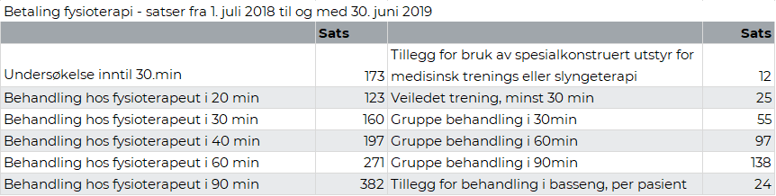 Satsene for egenandel er i samsvar med satsene for fysioterapeuter som har avtale om driftstilskudd. Satsene reguleres av forskriftene om stønad til dekning av utgifter til fysioterapi m.m. og reguleres årlig per 1. juli. Egenandelen teller med i opptjeningen til frikort for egenandelstak 2. Egenandelstak 2 er i forslag til Statsbudsjett 2019 satt til kr 2 085.