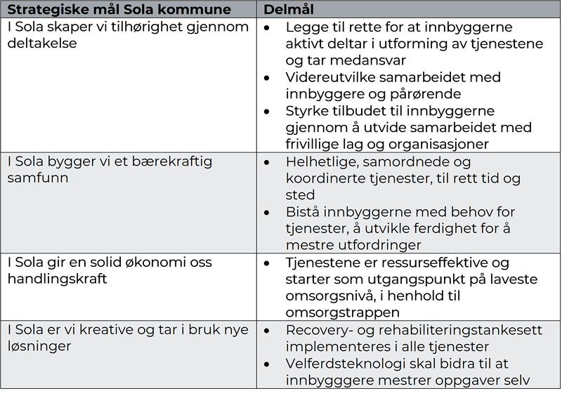 Sola kommune skal ivareta viktige fellesoppgaver i samfunnet gjennom å yte service og tjenester av rett kvalitet til innbyggere og næringsliv. Kommunen skal ha selvstendige virksomheter og medarbeidere som i samarbeid med brukerne og innbyggere tilrettelegger for god tjenesteyting.