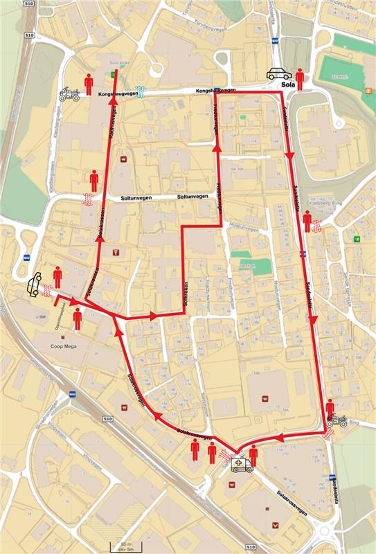 09.15: Fanebærere møter ved Coop Mega i Solakrossen (se oppstillingskartet lenger nede)